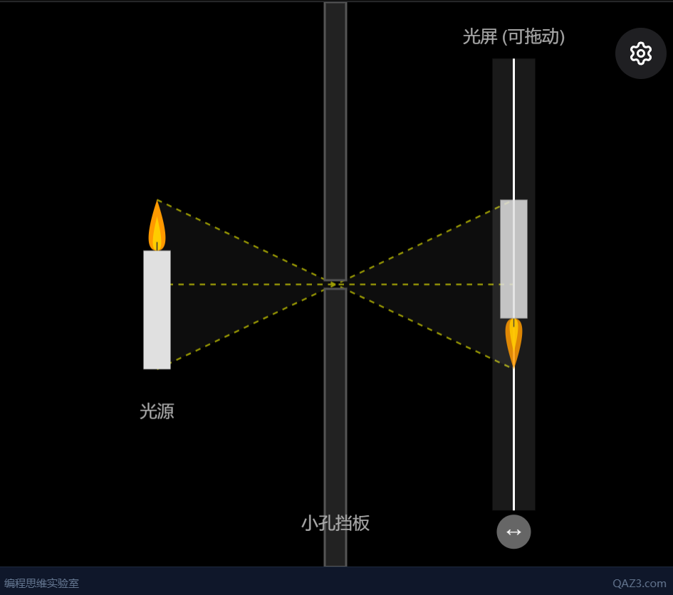 用一个带有小孔的板遮挡在屏幕与物之间,屏幕上就会形成物的倒像,我们把这样的现象叫小孔成像。前后移动中间的板,像的大小也会随之发生变化。这种现象反映了光线直线传播的性质。