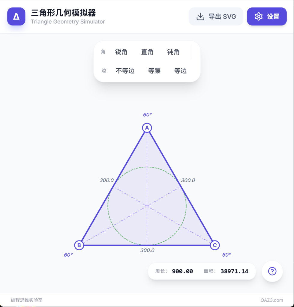 无论是初学者建立几何直觉,还是进阶者深入探究,这款模拟器都能让三角形的学习变得直观、高效且充满趣味。现在就动手“玩转”三角形,感受几何的动态之美吧!