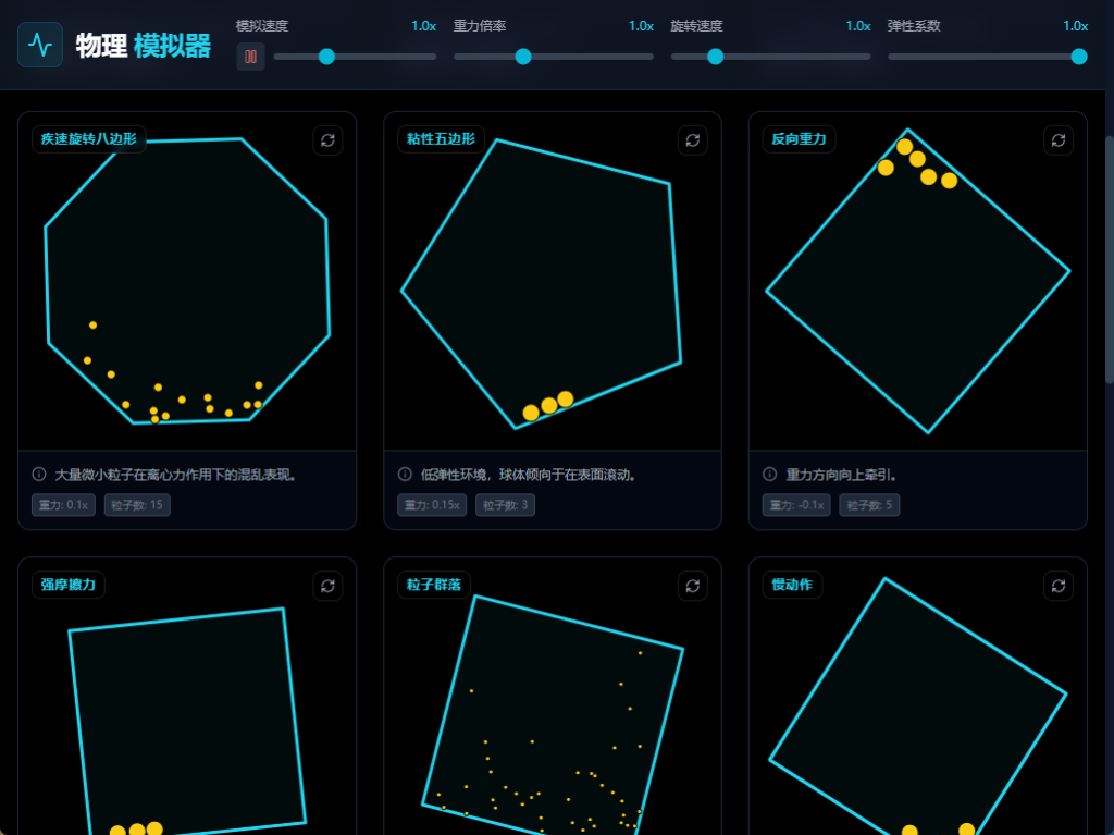 这是一个基于网页的交互式物理模拟器,允许用户实时调整多种物理参数,观察不同重力与形状环境下粒子的运动效果。通过调整参数,用户可以体验从经典物理到极限状况的各种模拟场景,适用于学习物理原理、可视化实验设计或作为探索工具。